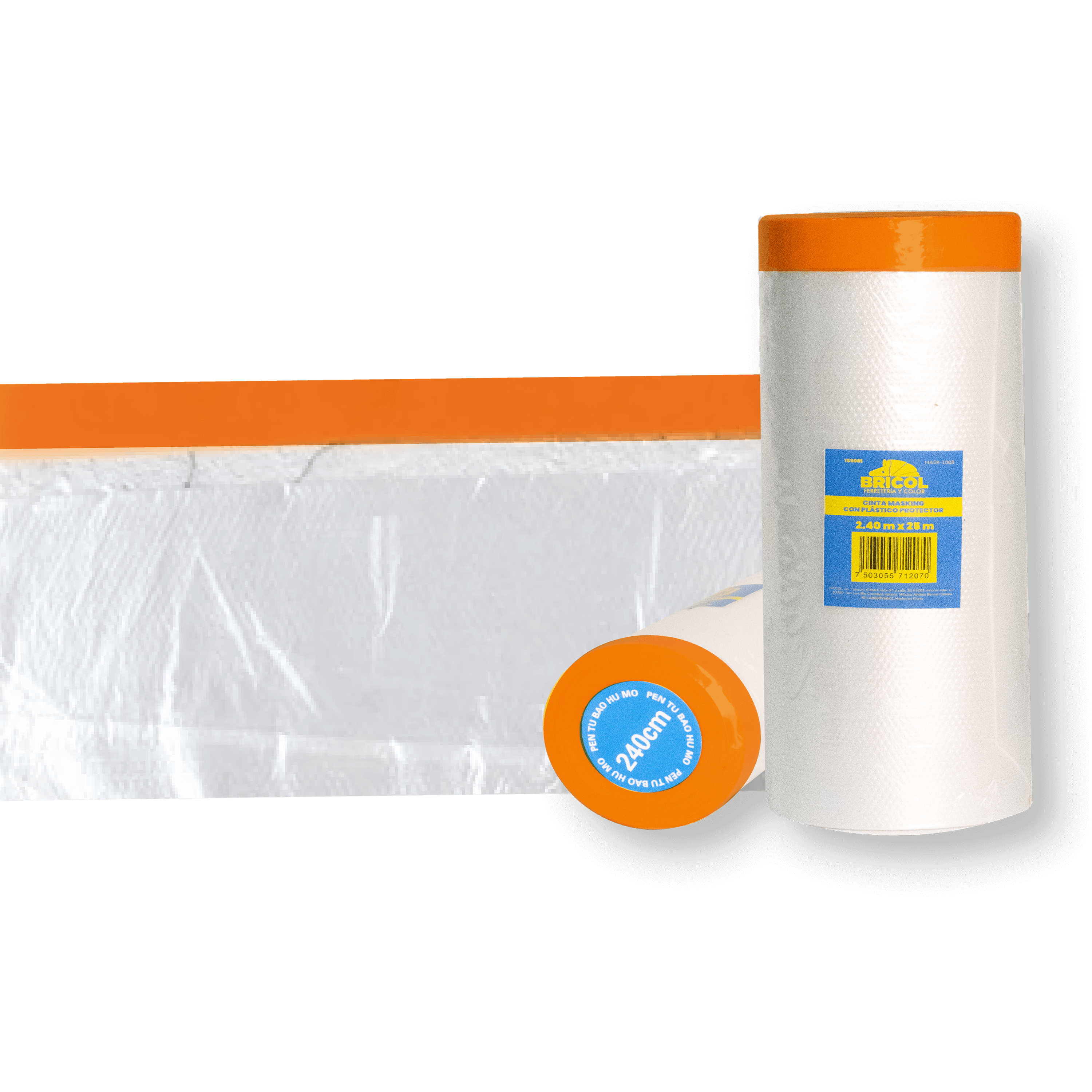 Cinta masking tape de 1/2 pulgada (12 mm) de ancho con plástico protector desplegable de hasta 2.4 metros, ideal para cubrir y proteger superficies durante trabajos de pintura. Con una longitud de 25 metros, permite realizar múltiples aplicaciones con eficiencia y rapidez.